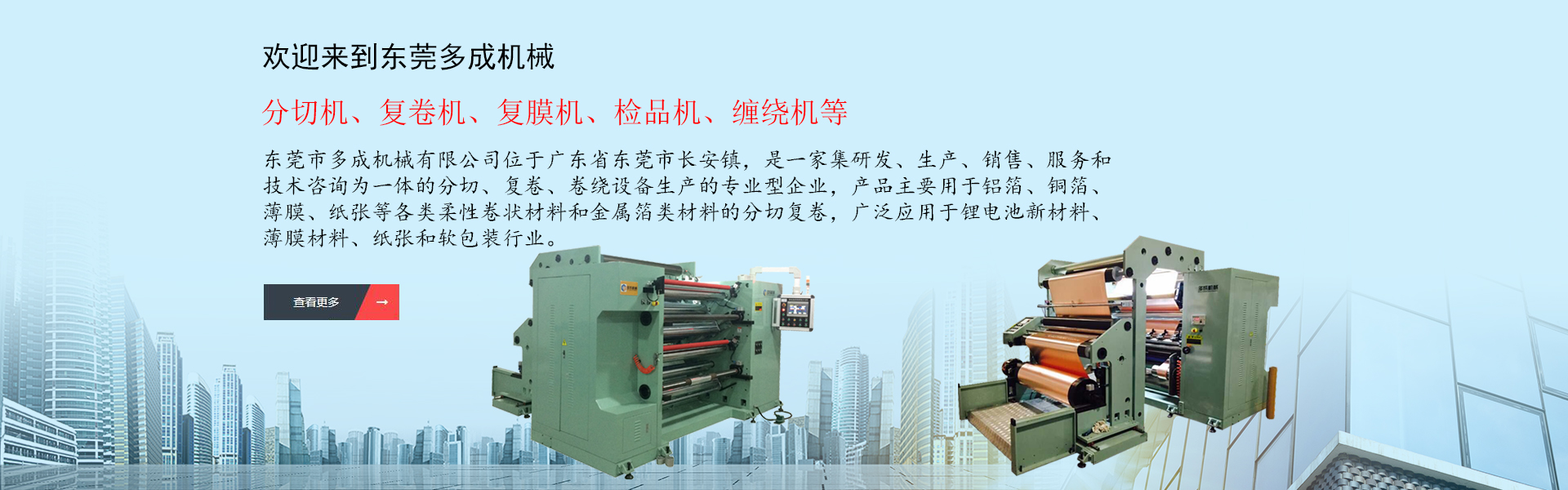 東莞市多成機(jī)械有限公司位于廣東省東莞市長(zhǎng)安鎮(zhèn),是一家集研發(fā)、生產(chǎn)、銷(xiāo)售、服務(wù)和技術(shù)咨詢?yōu)橐惑w的分切、復(fù)卷、卷繞設(shè)備生產(chǎn)的專業(yè)型企業(yè),產(chǎn)品主要用于鋁箔、銅箔、薄膜、紙張等各類柔性卷狀材料和金屬箔類材料的分切復(fù)卷,廣泛應(yīng)用于鋰電池新材料、薄膜材料、紙張和軟包裝行業(yè),產(chǎn)品范圍有分切機(jī)、復(fù)卷機(jī)、復(fù)膜機(jī)、檢品機(jī)、纏繞機(jī)等,是國(guó)內(nèi)外分切卷繞設(shè)備專業(yè)供應(yīng)商。